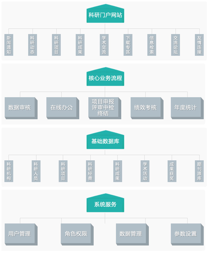 平臺從結(jié)構(gòu)上可以分為科研門戶網(wǎng)站和科研管理系統(tǒng)兩大部分。其中科研管理系統(tǒng)可以劃分為核心業(yè)務(wù)流程、基礎(chǔ)數(shù)據(jù)庫和系統(tǒng)服務(wù)三部分。