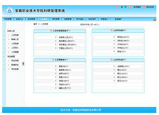 科研人員 科研人員指從事科研工作的老師、科研管理人員以及相關(guān)的科研輔助人員。人員庫構(gòu)建后,可以及時掌握學(xué)校科研人員的基本情況,并可以相應(yīng)的生成學(xué)校的專家?guī)?等。人員庫可以記錄人員的姓名、年齡、性別、職稱、職務(wù)、學(xué)位、學(xué)歷、學(xué)科方向、學(xué)術(shù)特長和聯(lián)系方式等信息。人員庫信息可以直接從學(xué)校人事管理系統(tǒng)中實時 轉(zhuǎn)入所需要的人員信息,保證信息的準(zhǔn)確性。